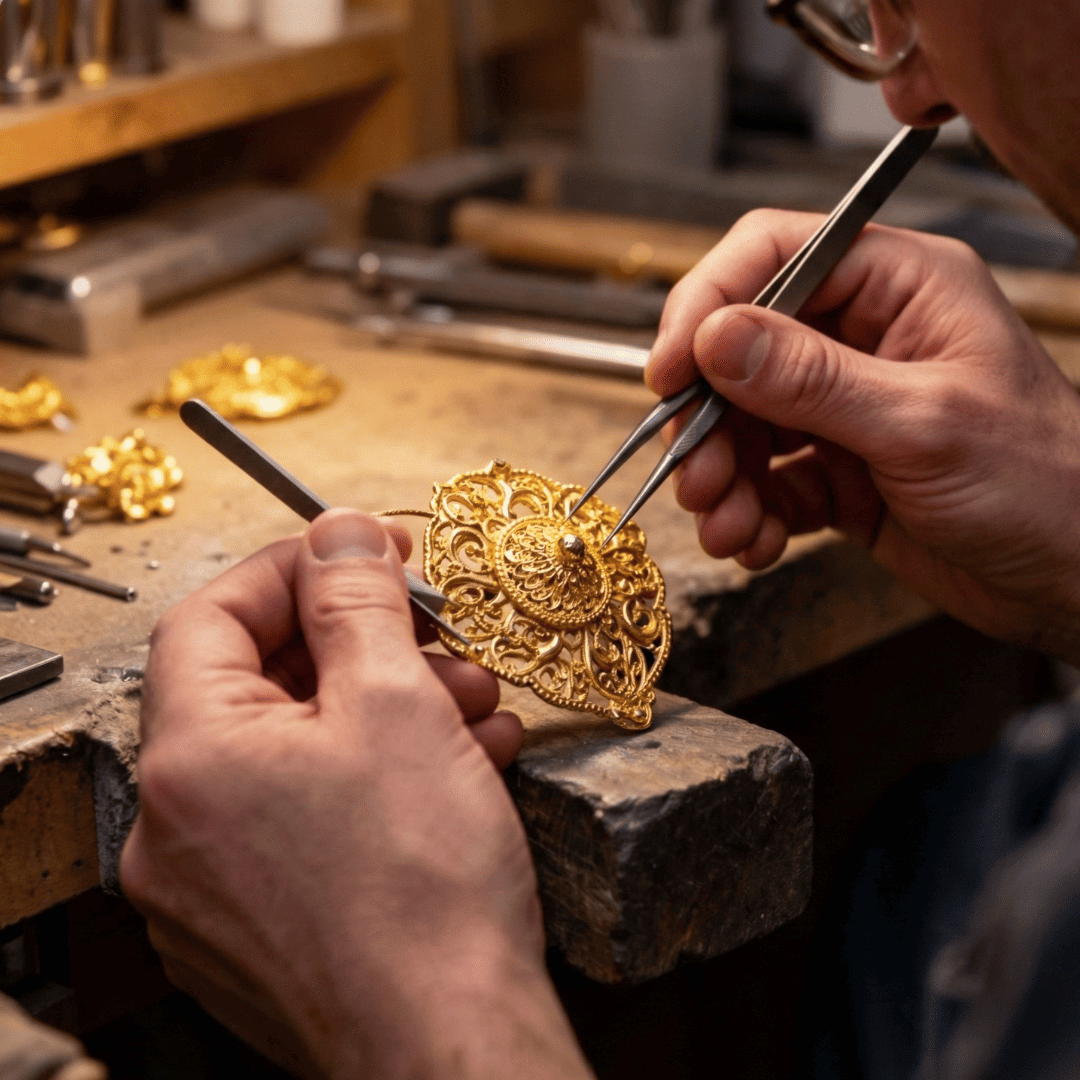 At Bhargav Arts, every piece of jewellery is a testament to centuries-old South Indian craftsmanship. Our artisans, trained in the sacred traditions of temple jewellery making, pour their soul into each intricate design.