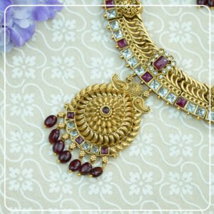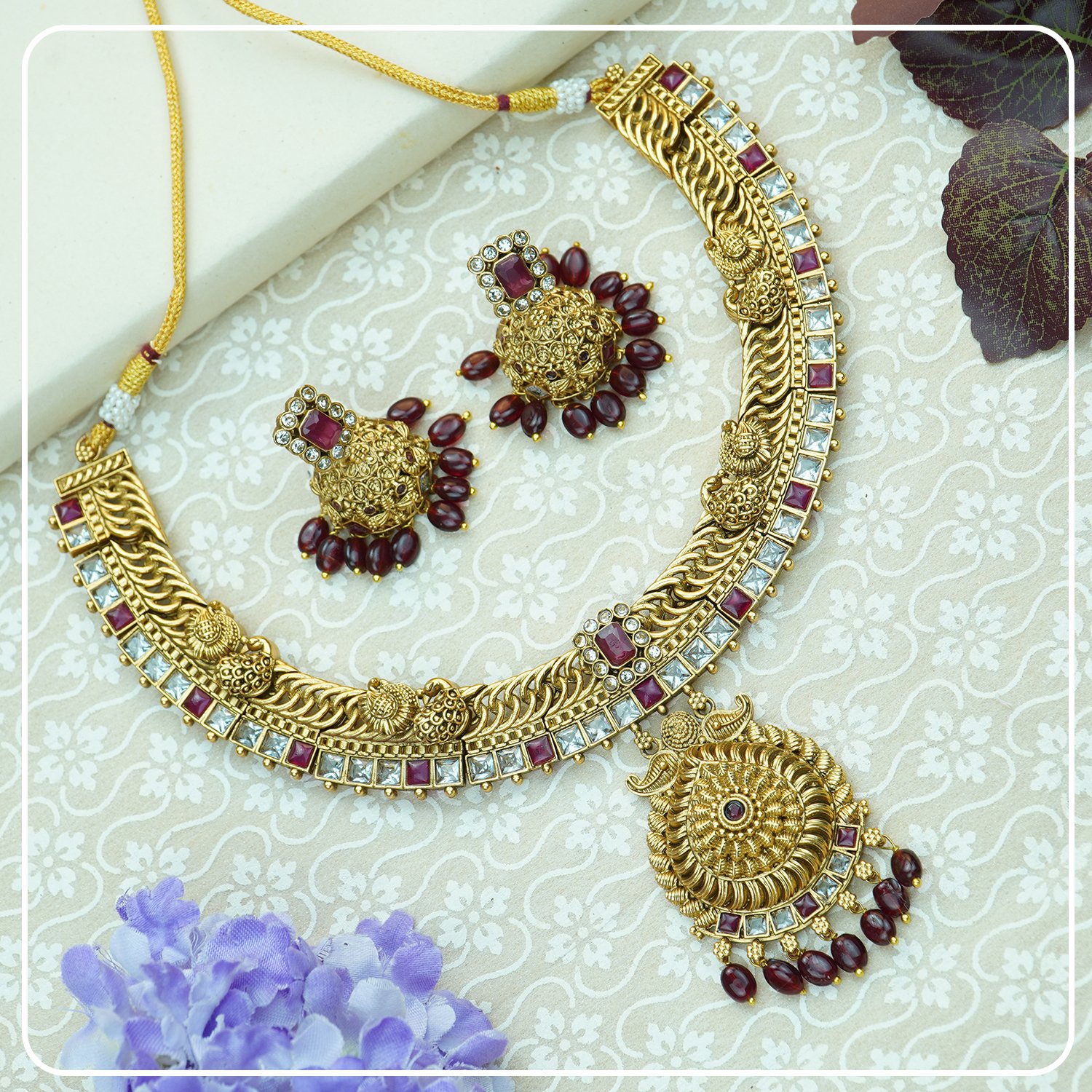 Elevate your traditional look with this stunning temple-inspired necklace set, meticulously crafted to exude timeless elegance and cultural charm. The set features a majestic gold-toned necklace adorned with intricate motifs, a dazzling array of square-cut red and white stones, and a grand pendant embellished with delicate red teardrop beads for a graceful finish.