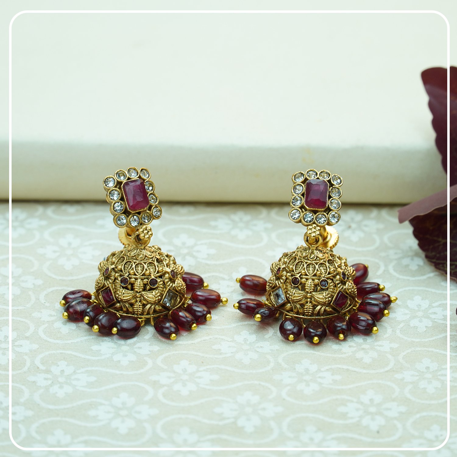 The matching earrings mirror the necklace’s ornate design, combining detailed gold craftsmanship with the same vibrant stones and soft red accents, making this set perfect for weddings, festivals, and special occasions.