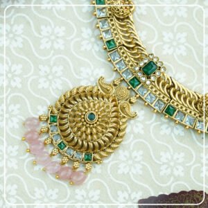 Elevate your traditional look with this stunning temple-inspired necklace set, meticulously crafted to exude timeless elegance and cultural charm. The set features a majestic gold-toned necklace adorned with intricate motifs, a dazzling array of square-cut green and white stones, and a grand pendant embellished with delicate pink teardrop beads for a graceful finish.