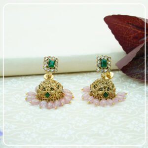 The matching earrings mirror the necklace’s ornate design, combining detailed gold craftsmanship with the same vibrant stones and soft pink accents, making this set perfect for weddings, festivals, and special occasions.