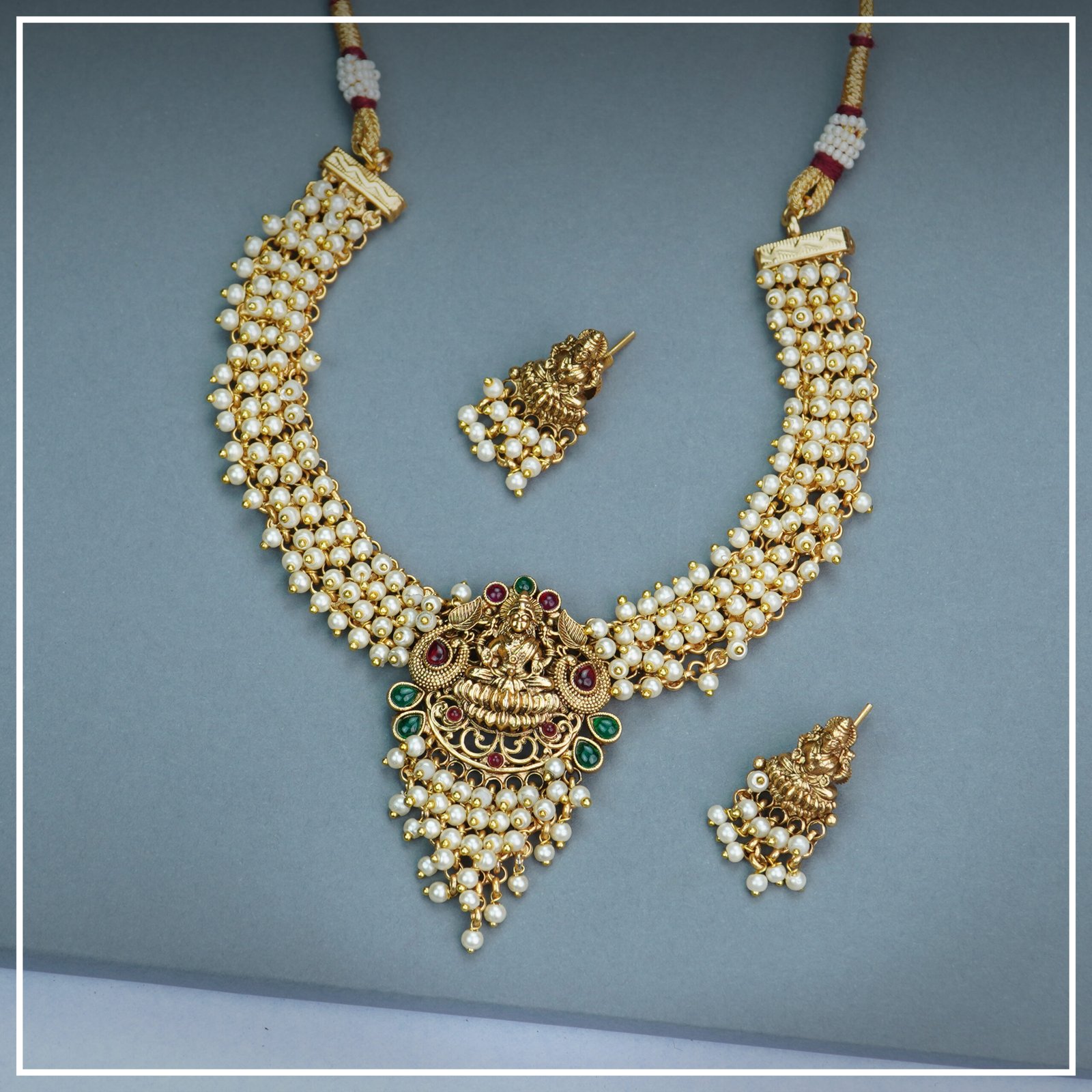 This copper finish necklace, adorned with intricate white beads and Lakshmi, exudes a stunning, traditional charm The beaded accents, spread throughout the necklace and paired with elegant earrings, Ideal for daily use and also weddings & festive, this necklace adds a touch of timeless beauty, it is adorned with like rubies and stone. necklace is with Mop chains its help for arrange necklace length.