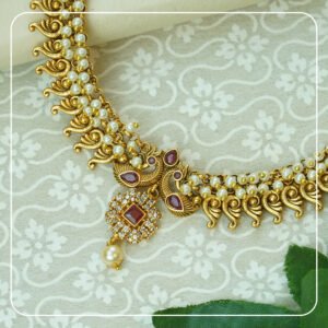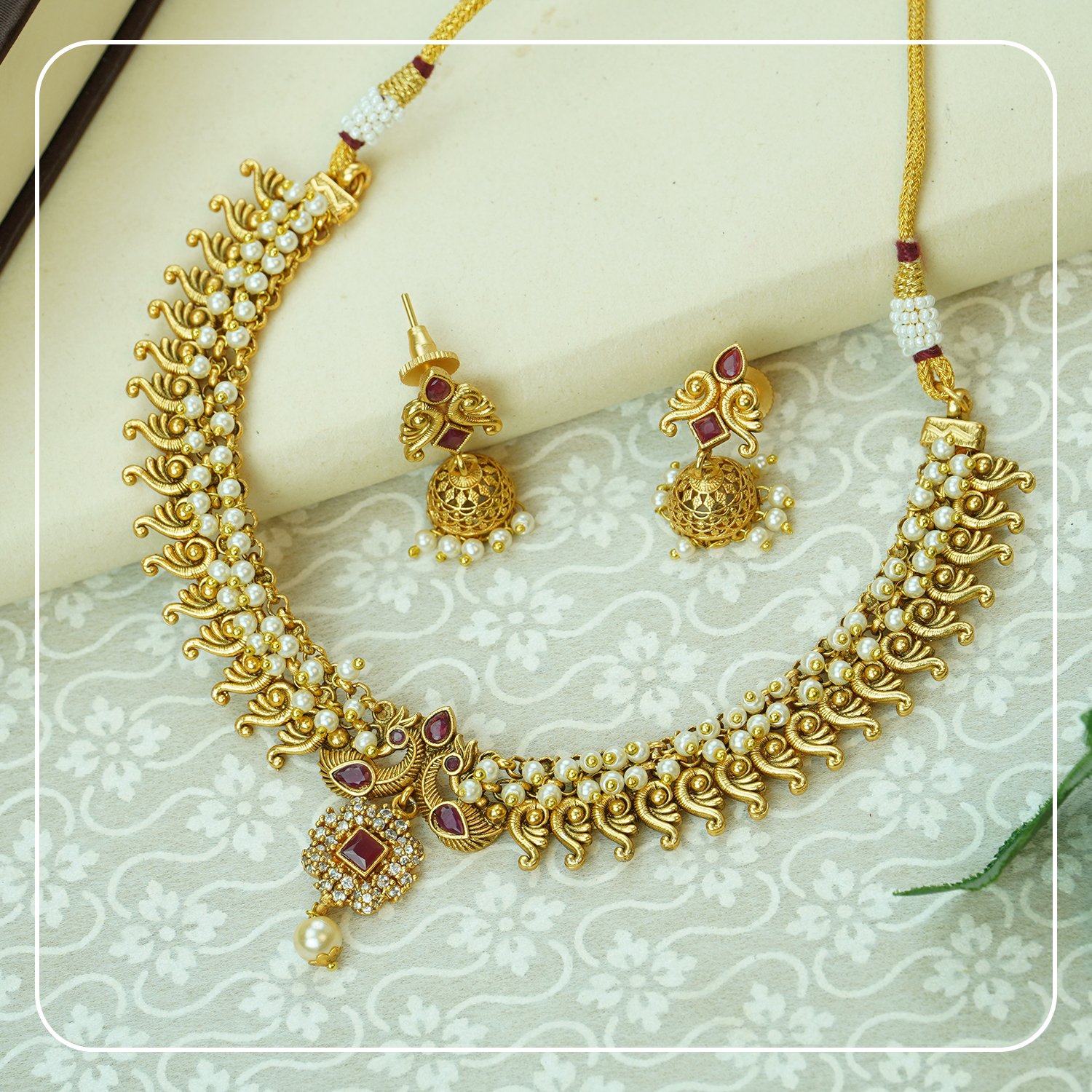 This copper-finished necklace, adorned with intricate white beads and exquisite peacock designs, radiates a timeless, traditional charm. The beaded accents, elegantly spread throughout the necklace, are beautifully complemented by the addition of rubies stones, enhancing its overall appeal. The necklace features Mop chains, allowing for an adjustable length to ensure a perfect fit. Paired with matching earrings, secured with a post and back closure, this set is ideal for daily wear, as well as for weddings and festive occasions. It adds a touch of elegance and sophistication, making it a versatile and stunning accessory.