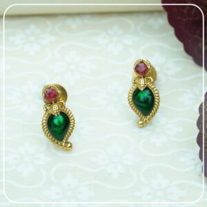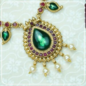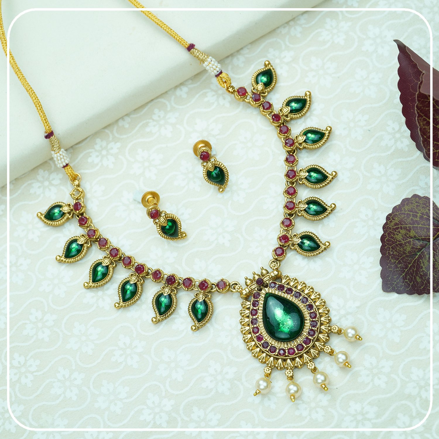 Enhance your traditional look with this elegant gold-plated necklace set, featuring intricate palakka design and striking green enamel work. The leaf-shaped pendants are adorned with detailed scroll motifs, blending timeless craftsmanship with classic charm. Paired with matching earrings, the set includes an adjustable dori-style closure with decorative beads for a comfortable fit. Perfect for festivals, weddings, and special occasions, this versatile set adds a refined touch to both traditional and modern outfits.