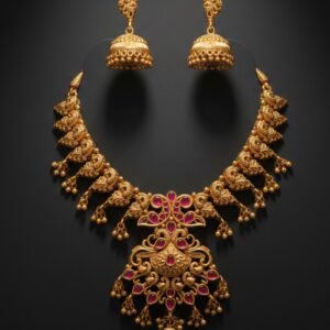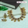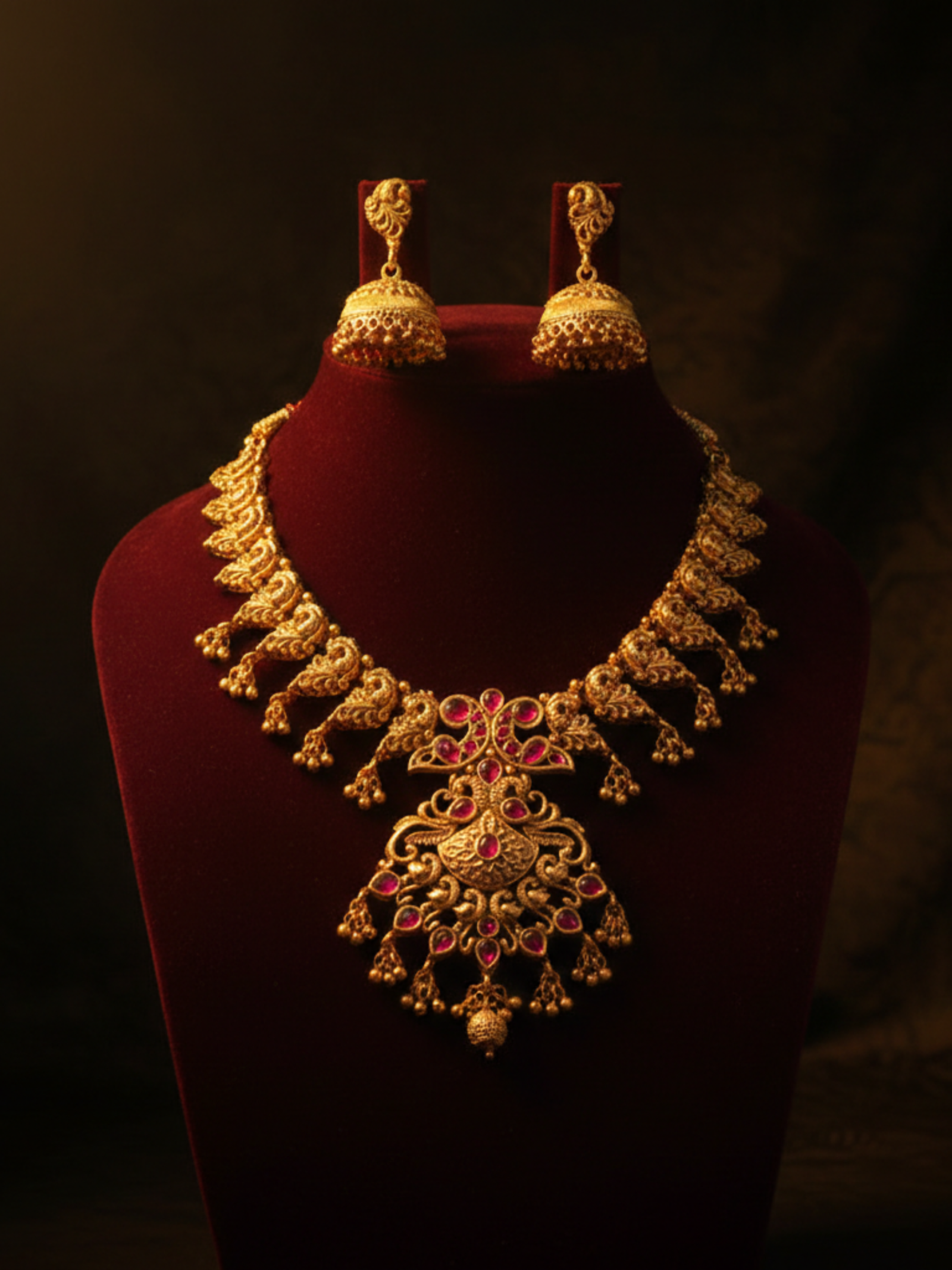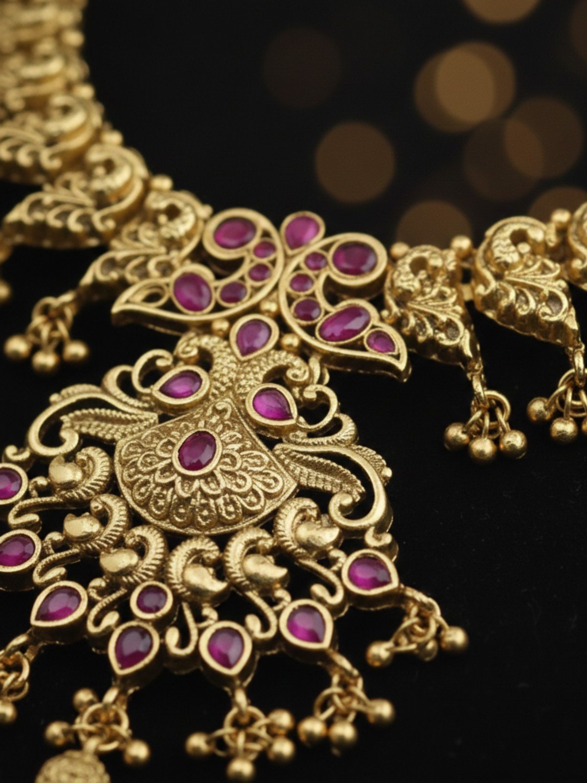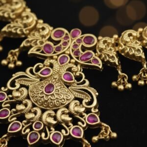 Elevate your style with the exquisite beauty of this brass-finish necklace set, which exudes timeless charm and elegance. Crafted from high-quality brass, it features a subtle shine and smooth texture. The necklace showcases a stunning peacock design, complemented by ruby stones and gold beads for a luxurious touch. Paired with matching earrings, this detailed set is perfect for any occasion. The necklace is designed with MOP chains, allowing you to adjust its length for a customized fit.