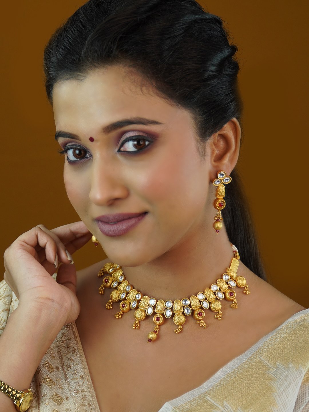 Elevate your style with the exquisite beauty with brass finish necklace set exudes timeless charm and elegance. Made with high-quality brass, it features a subtle shine and smooth texture. The detailed necklace, paired with matching earrings, suits for every occasions. necklace is with Mop chains its help for arrange necklace length.