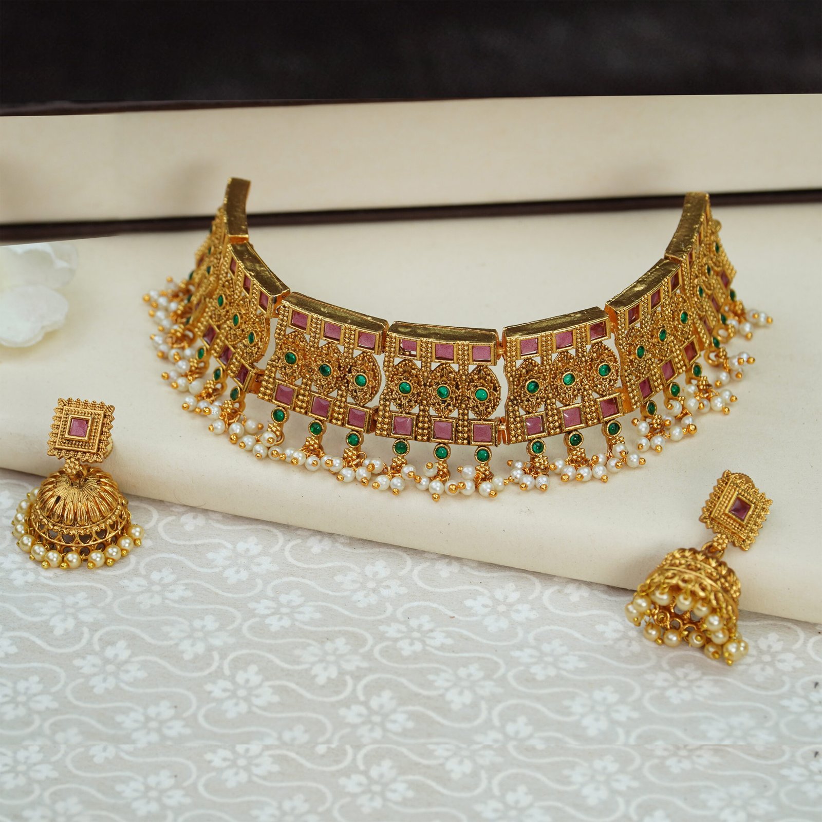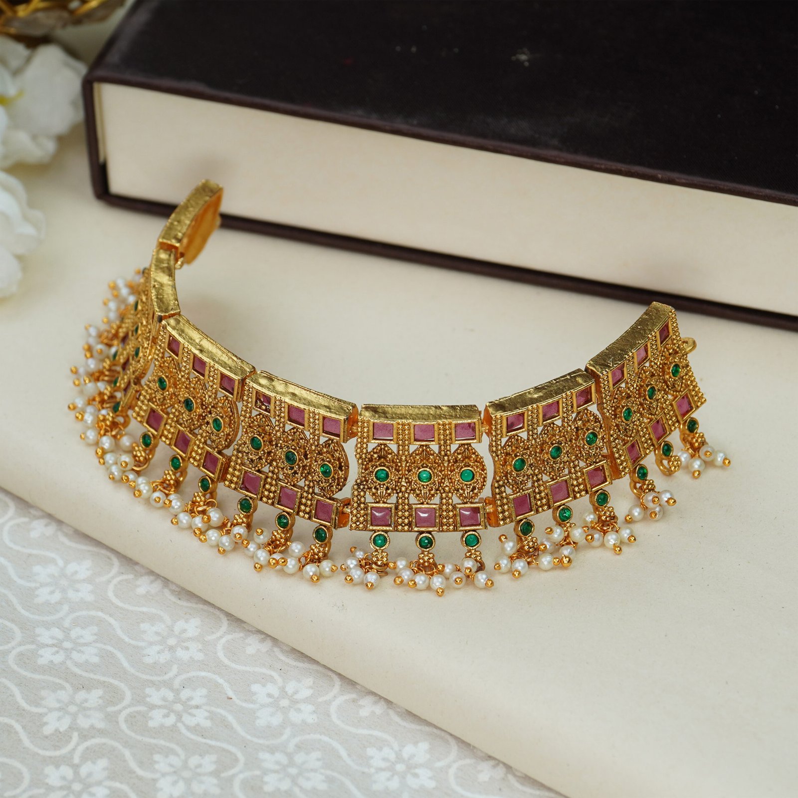 No Direct Perfume, Deo, Water, And Spray On The Jewellery. First Wear Your Makeup, Perfume – Then Wear Your Jewellery. This Will Keep Your Jewellery Shining For Years. Please Store In Air-Tight Container. Do Not Store In Velvet Boxes