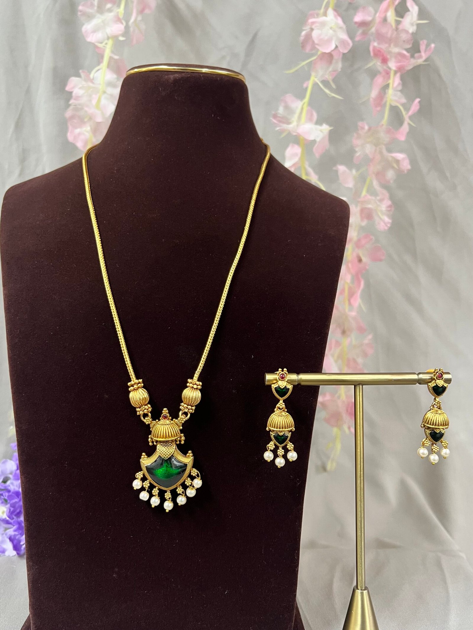 Lightweight yet eye-catching, this pendant set is ideal for festive occasions, weddings, traditional celebrations, and ethnic wear styling. Whether paired with a saree, lehenga, or salwar suit, the Ishwari Antique Pendant Set adds effortless grace and sophistication.