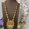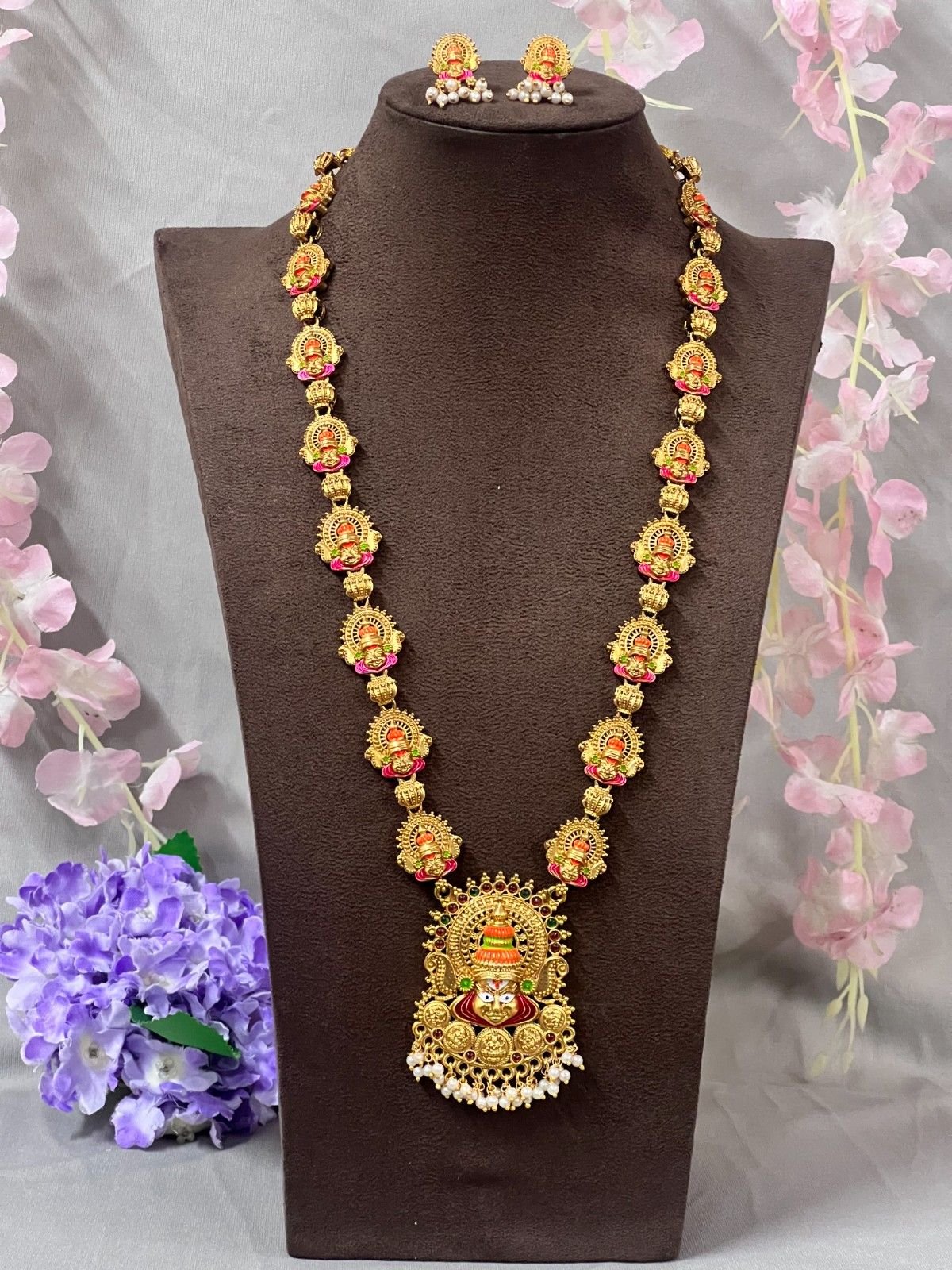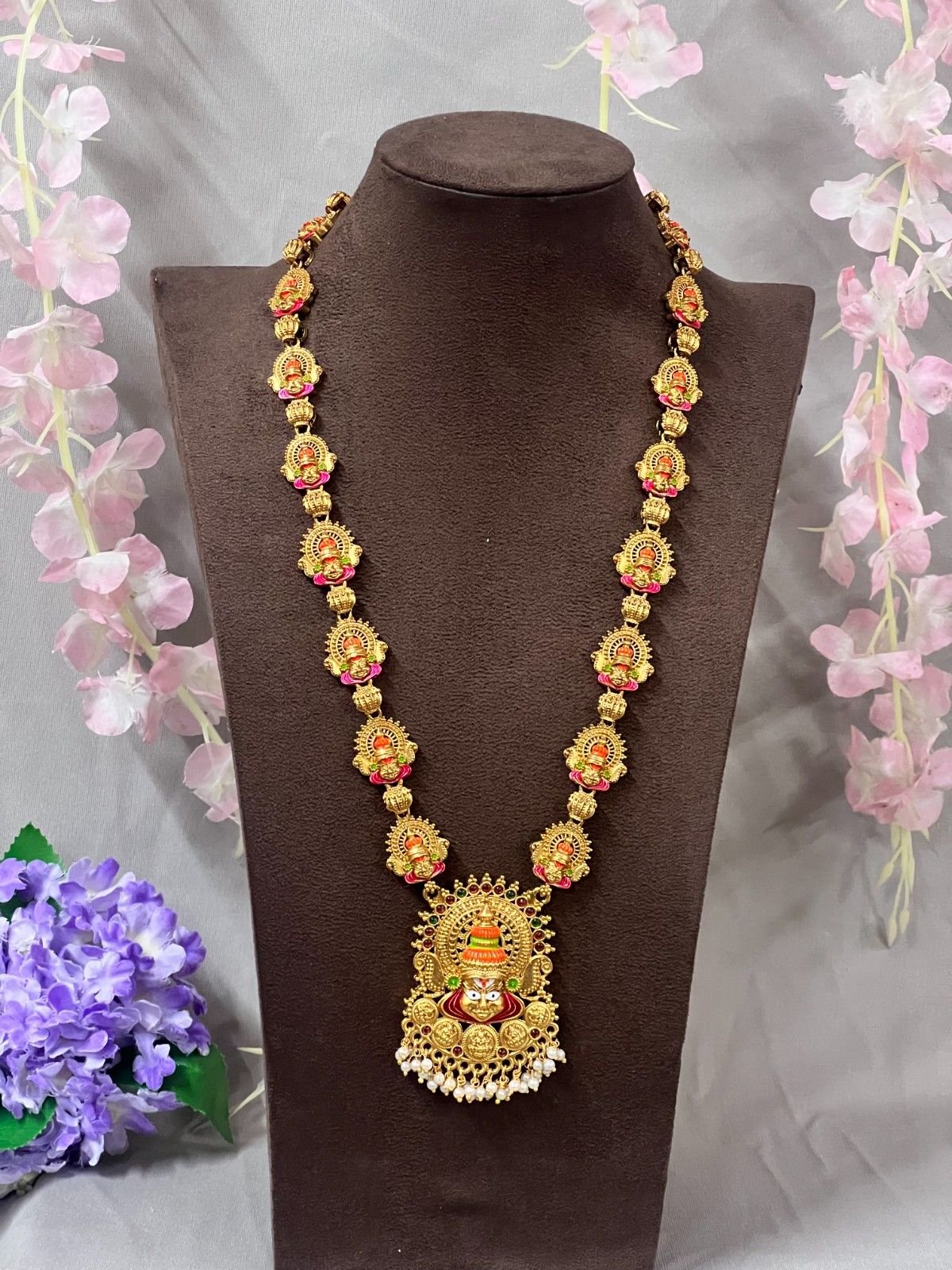 Each link of the long haram is adorned with miniature deity motifs and antique gold finish elements, giving it a rhythmic, dance-like flow reminiscent of ceremonial temple ornaments. Perfect for festive wear, weddings, and traditional attire, this piece effortlessly elevates silk sarees and ethnic ensembles into regal looks.