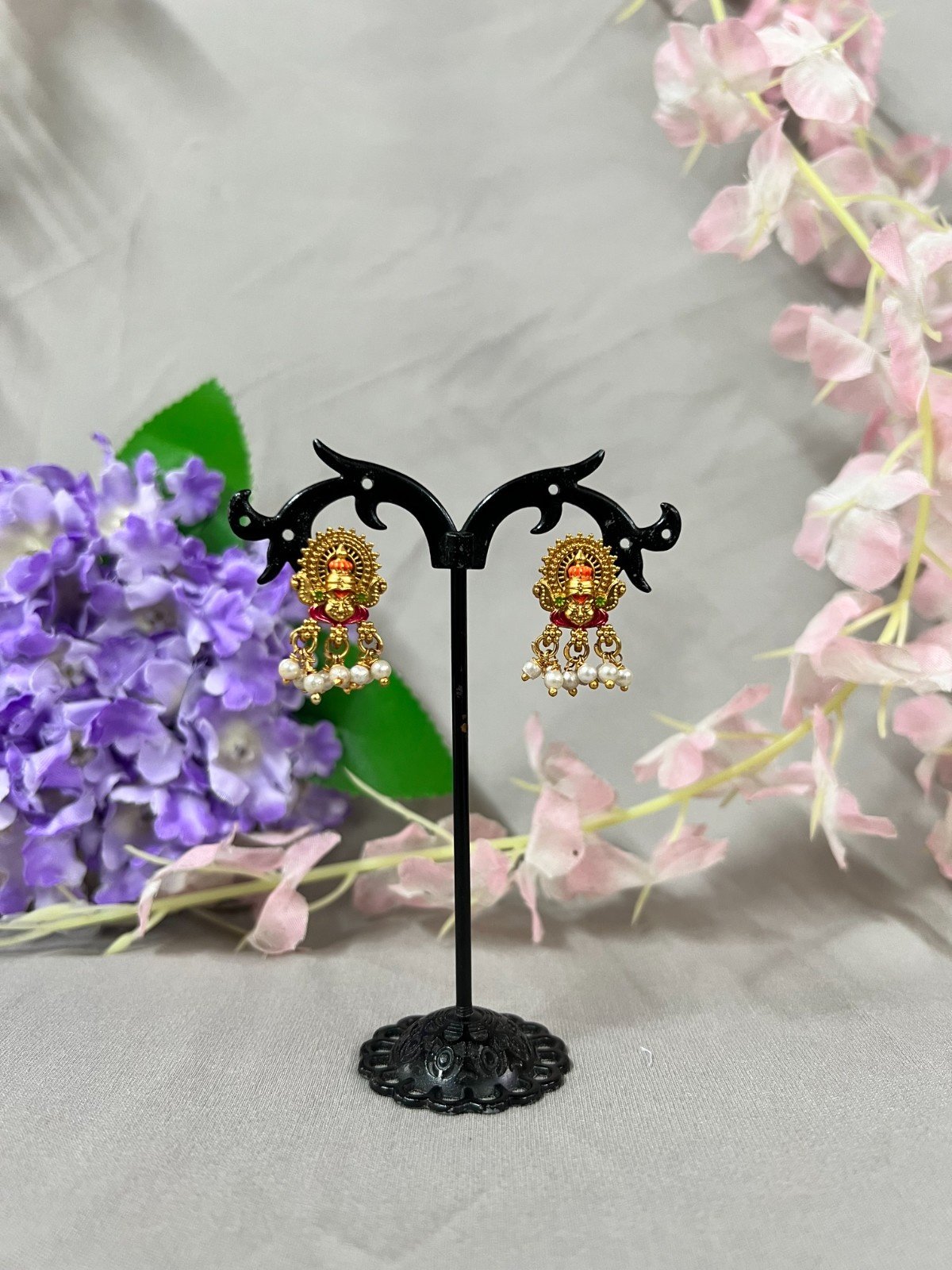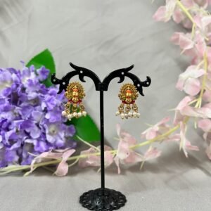 Inspired by the dramatic expressions and rich ornamentation of the classical Kathakali art form, this temple-style long necklace is crafted to make a powerful traditional statement. The intricately carved central pendant features a divine face motif, surrounded by ornate detailing, ruby-tone accents, and delicate pearl danglings — capturing the grandeur of South Indian heritage jewellery.