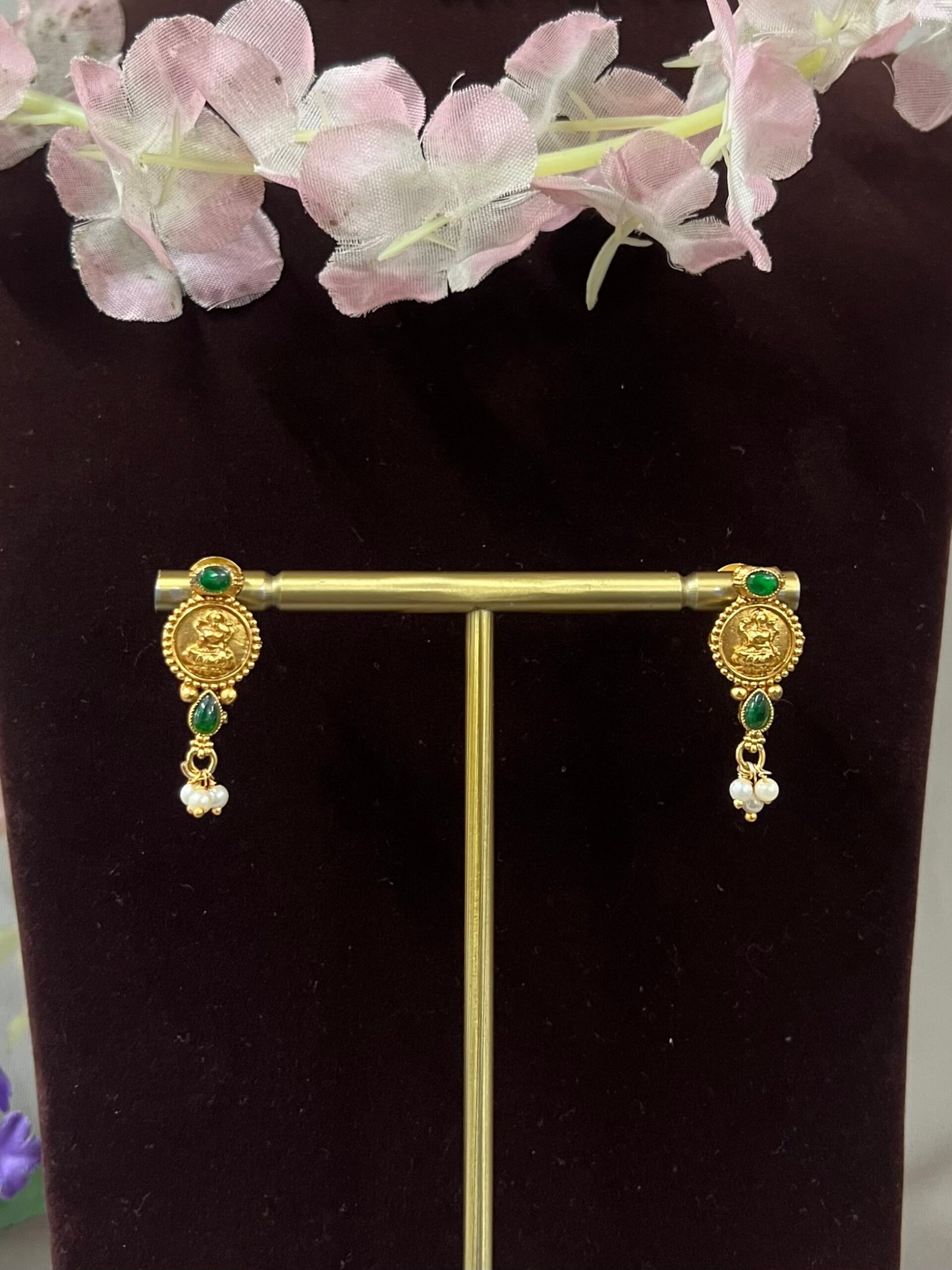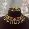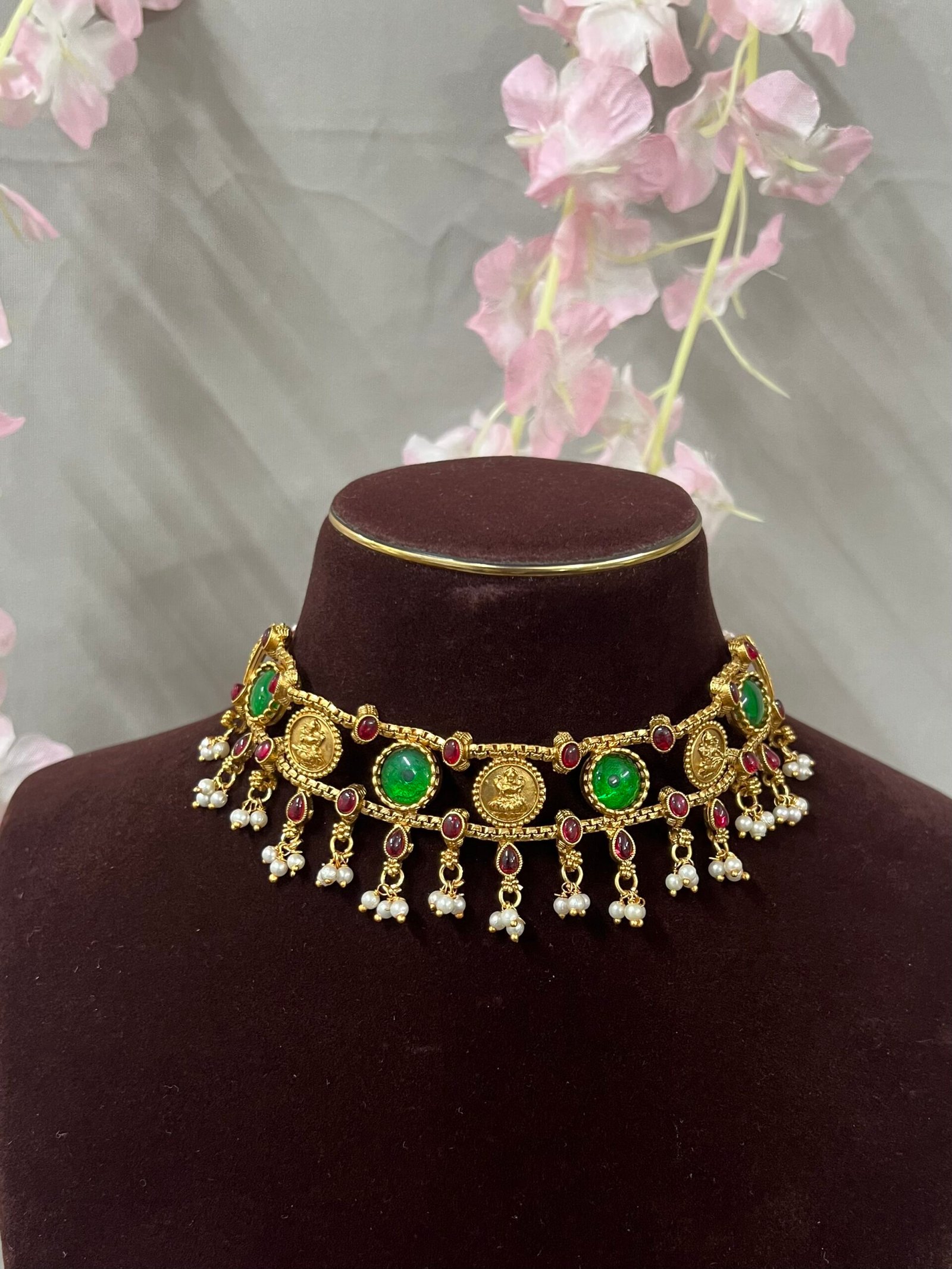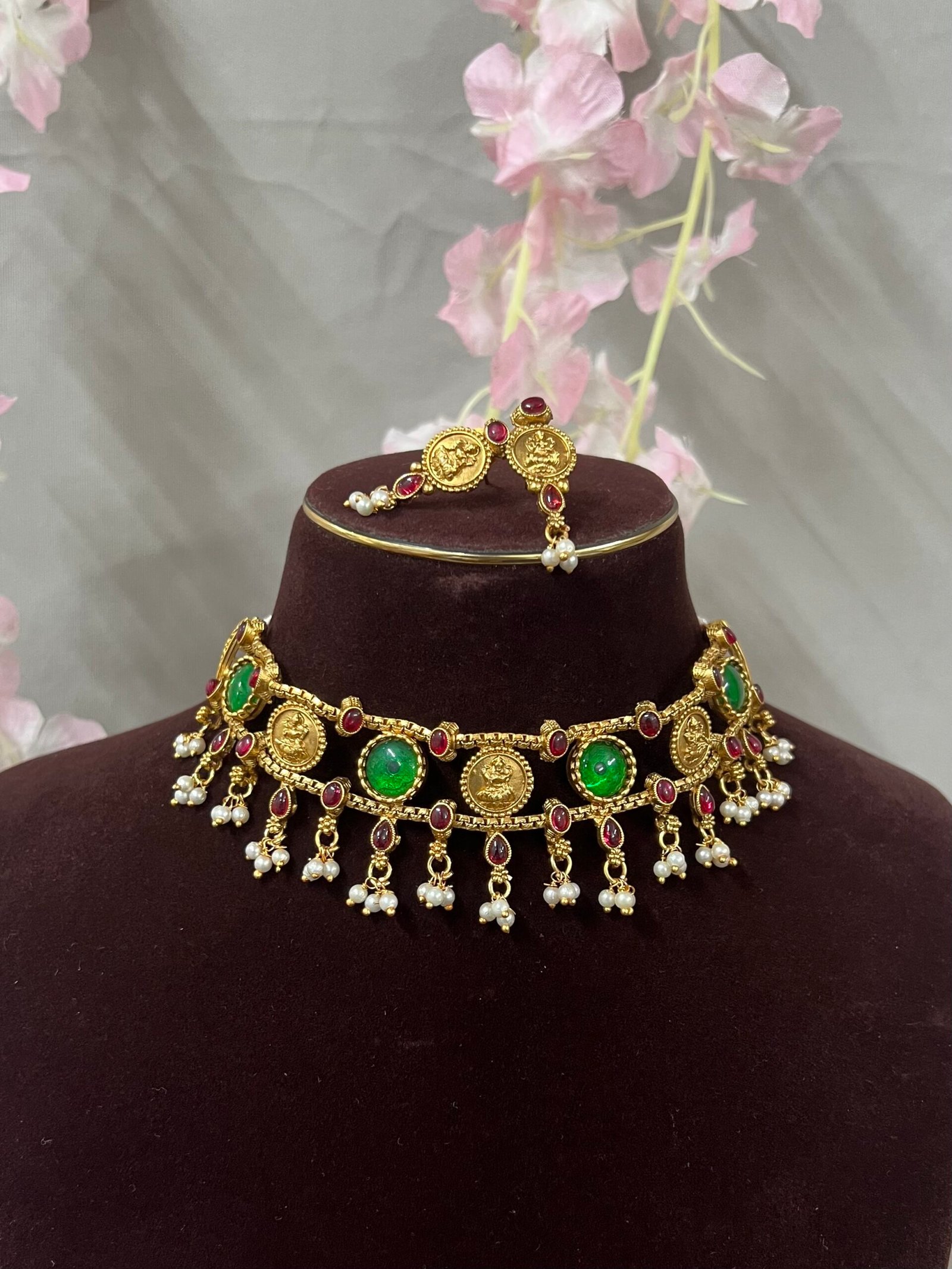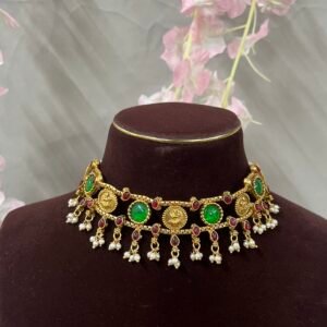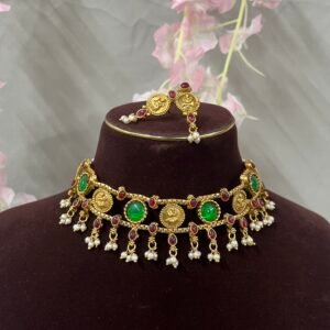 An elegant antique temple choker featuring intricate Lakshmi coin motifs, vibrant emerald green and ruby red stones, and delicate pearl danglers. Paired with matching earrings, this traditional set adds a regal touch to festive and bridal looks.
