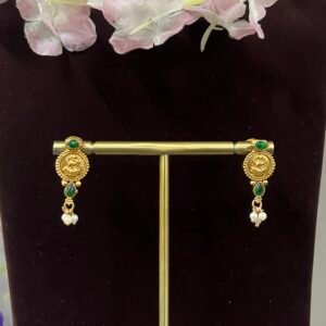 The Manikya Lakshmi Antique Choker Set is a beautiful expression of traditional craftsmanship and timeless elegance. Designed in a classic temple jewelry style, the choker showcases detailed Lakshmi coin motifs symbolizing prosperity and grace. The design is enriched with striking emerald green stones and ruby red accents, creating a vibrant contrast against the antique gold finish.