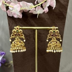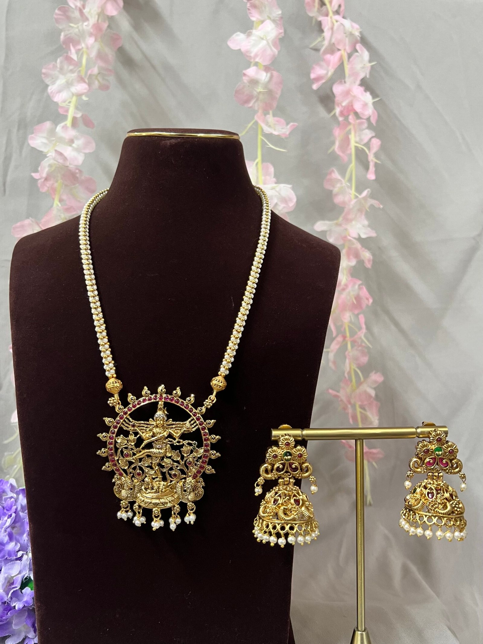 A majestic antique temple necklace set featuring a divine dancing deity pendant encircled with ruby stones, paired with intricately crafted jhumkas adorned with pearls and traditional detailing.
