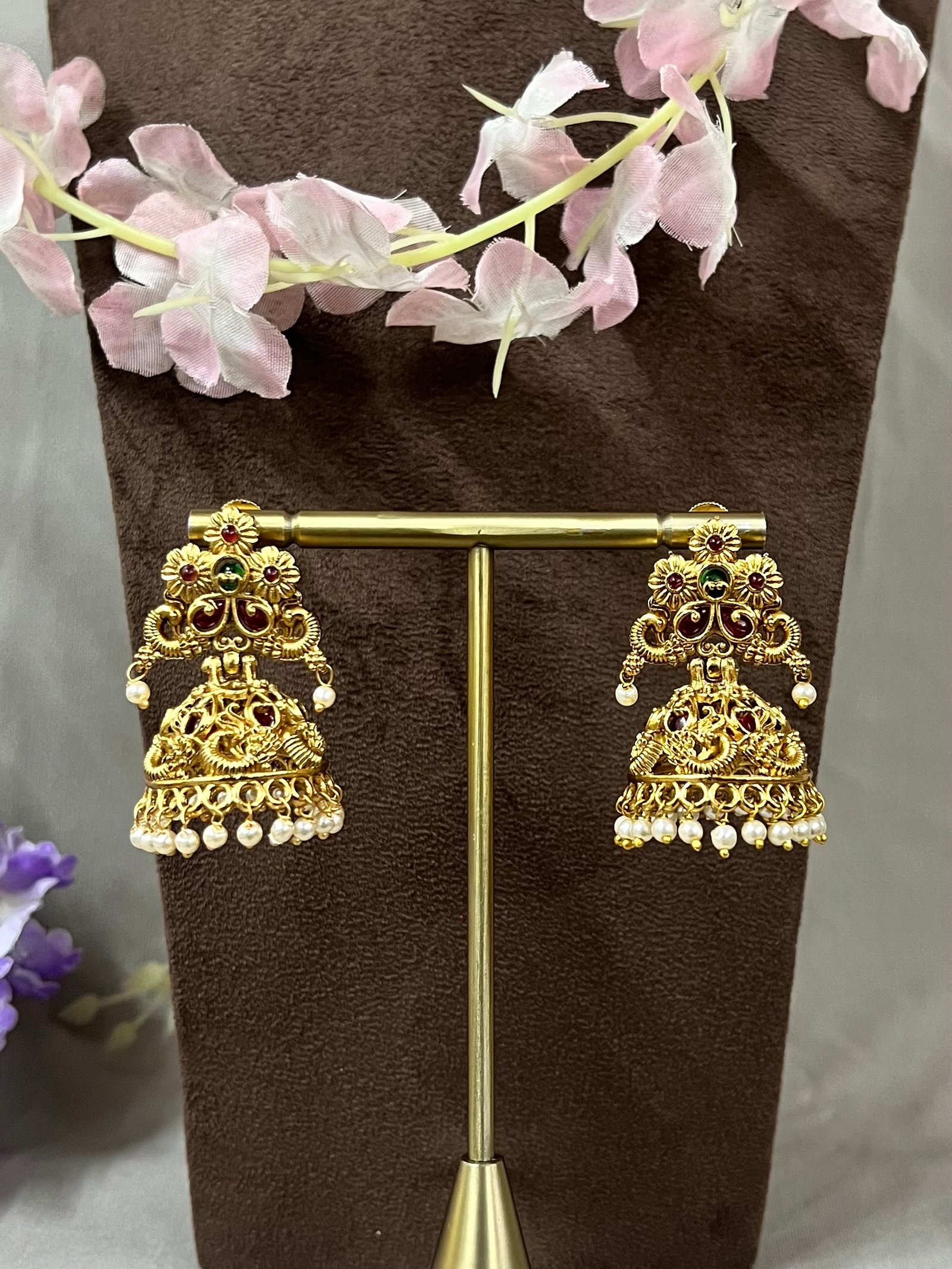 The set includes matching antique-finish jhumka earrings featuring floral and peacock-inspired carvings, highlighted with ruby and green stone accents. The pearl danglers add graceful movement and elevate the overall festive appeal.