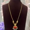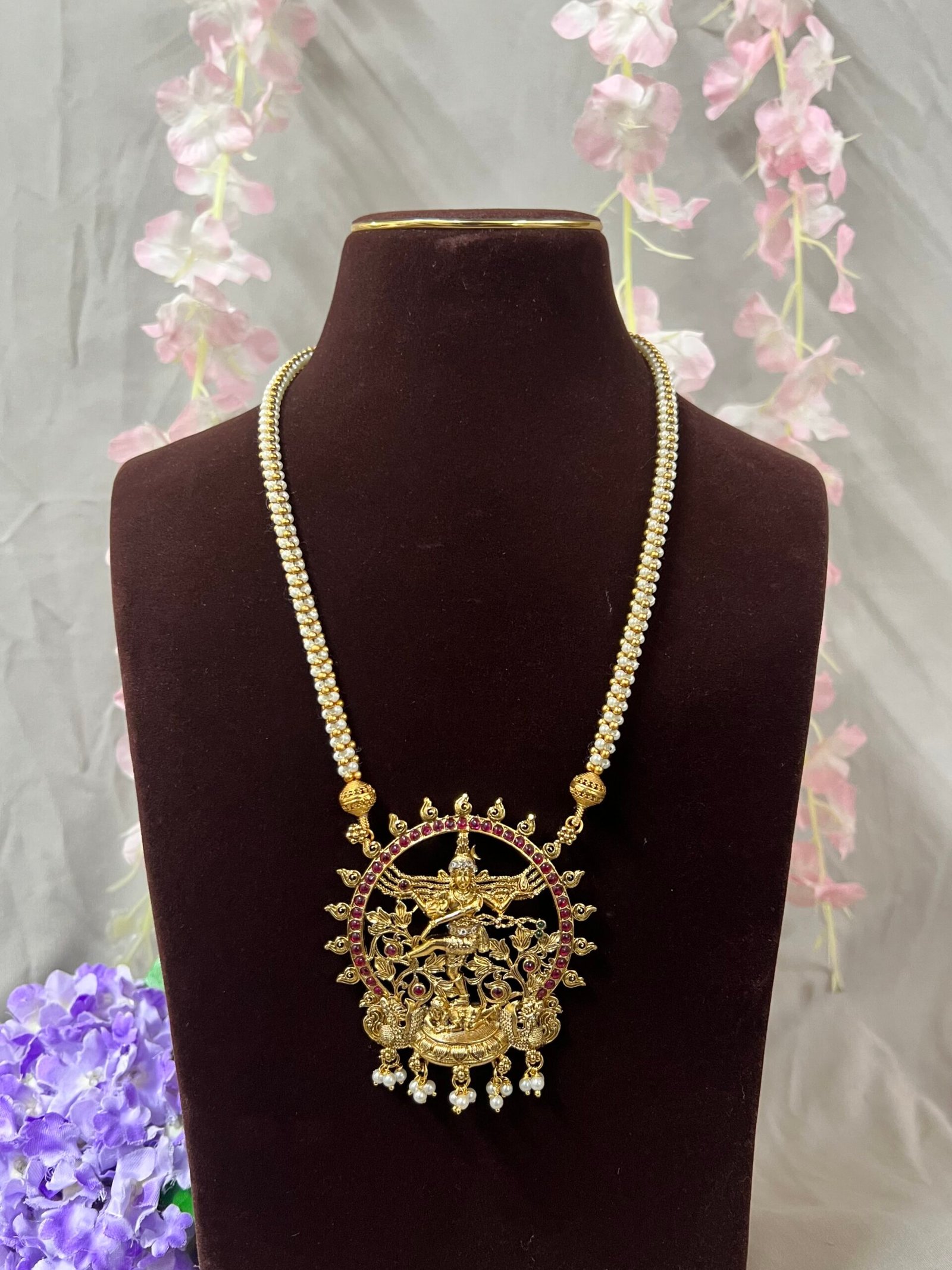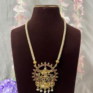 The necklace chain is delicately embellished with pearl detailing that enhances its richness while maintaining a refined traditional aesthetic. The intricate craftsmanship reflects heritage temple jewelry styles, making it a statement piece for special occasions.