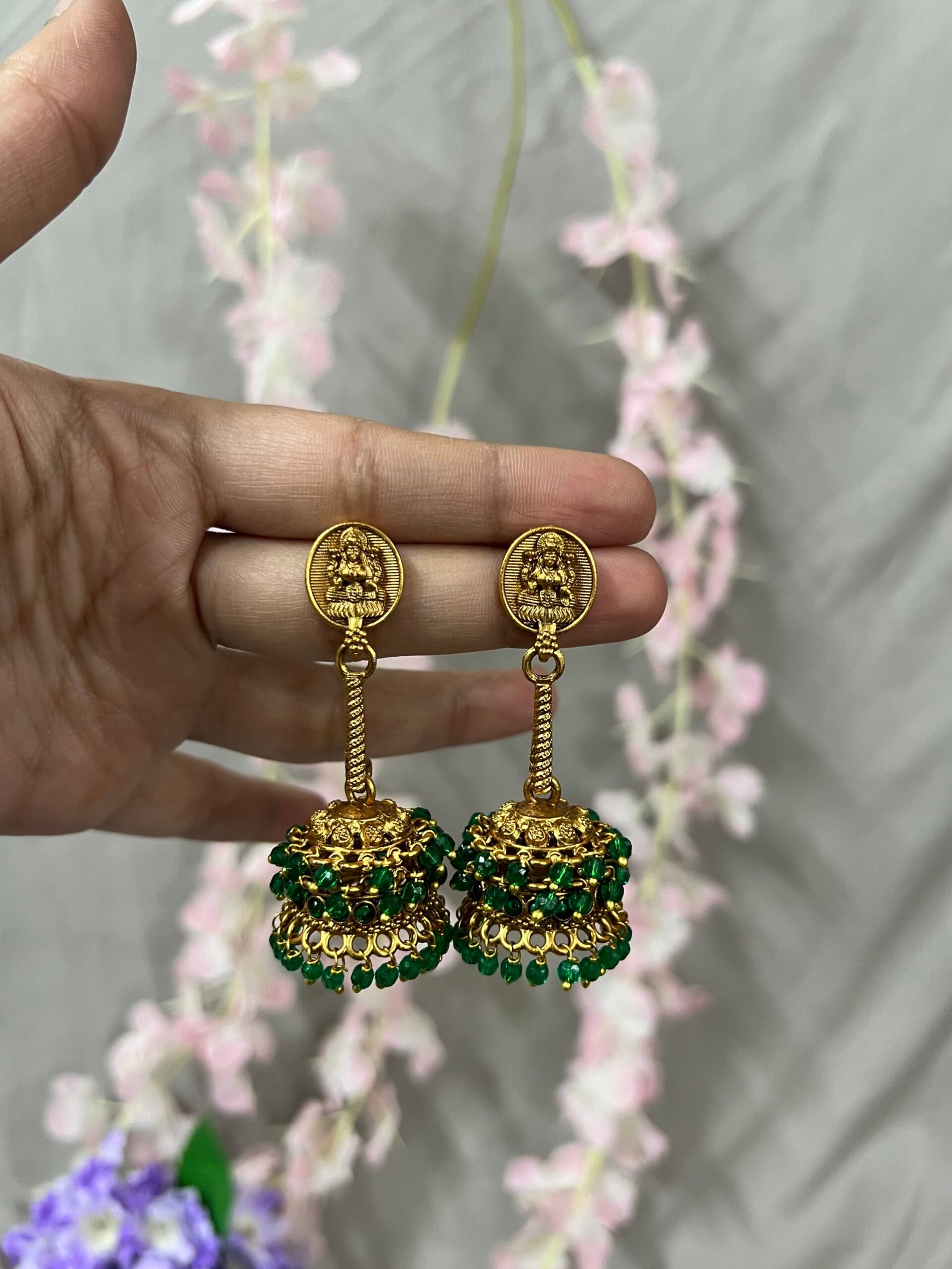The dome-shaped jhumkas are adorned with vibrant emerald green beads arranged in delicate layers, adding richness and movement to the design. The antique gold finish enhances the traditional charm, making these earrings a striking yet elegant statement.