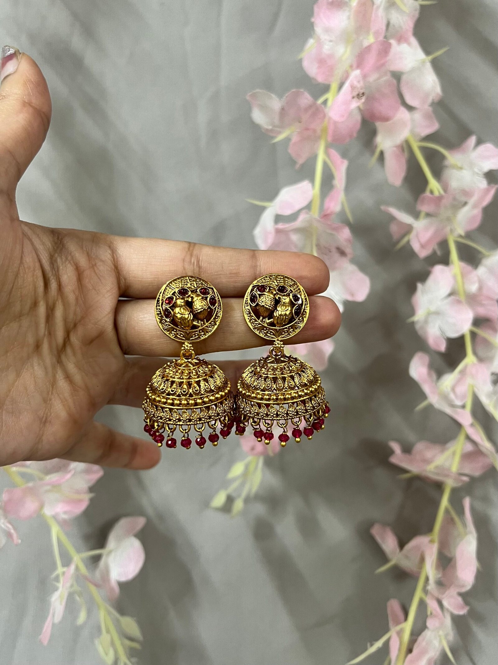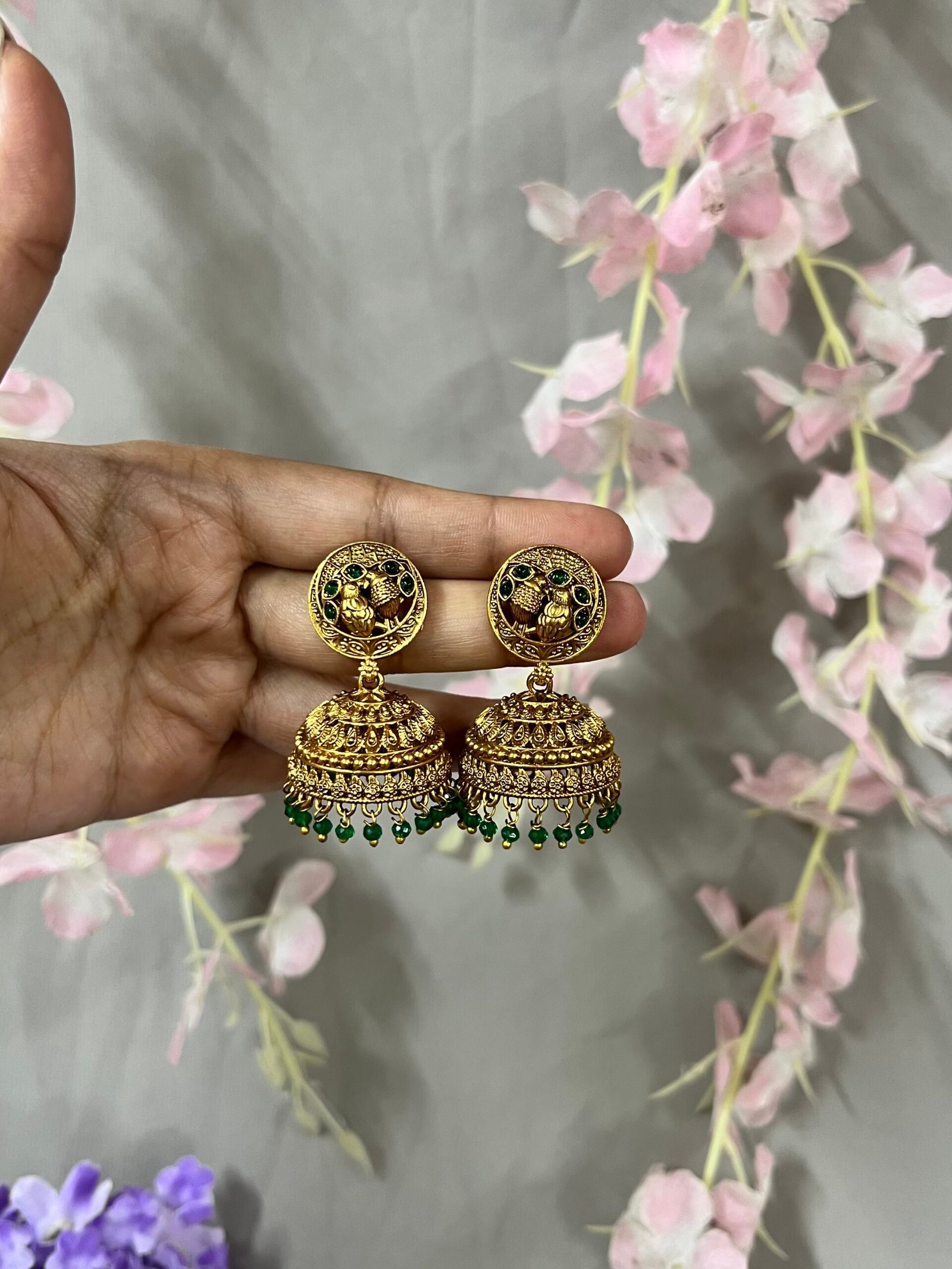 Inspired by classic South Indian temple designs, these antique gold jhumkas feature a beautifully carved peacock motif stud, symbolizing grace and prosperity. The detailed dome-shaped jhumka showcases intricate filigree work and layered texture, giving the earrings a rich, royal appearance.