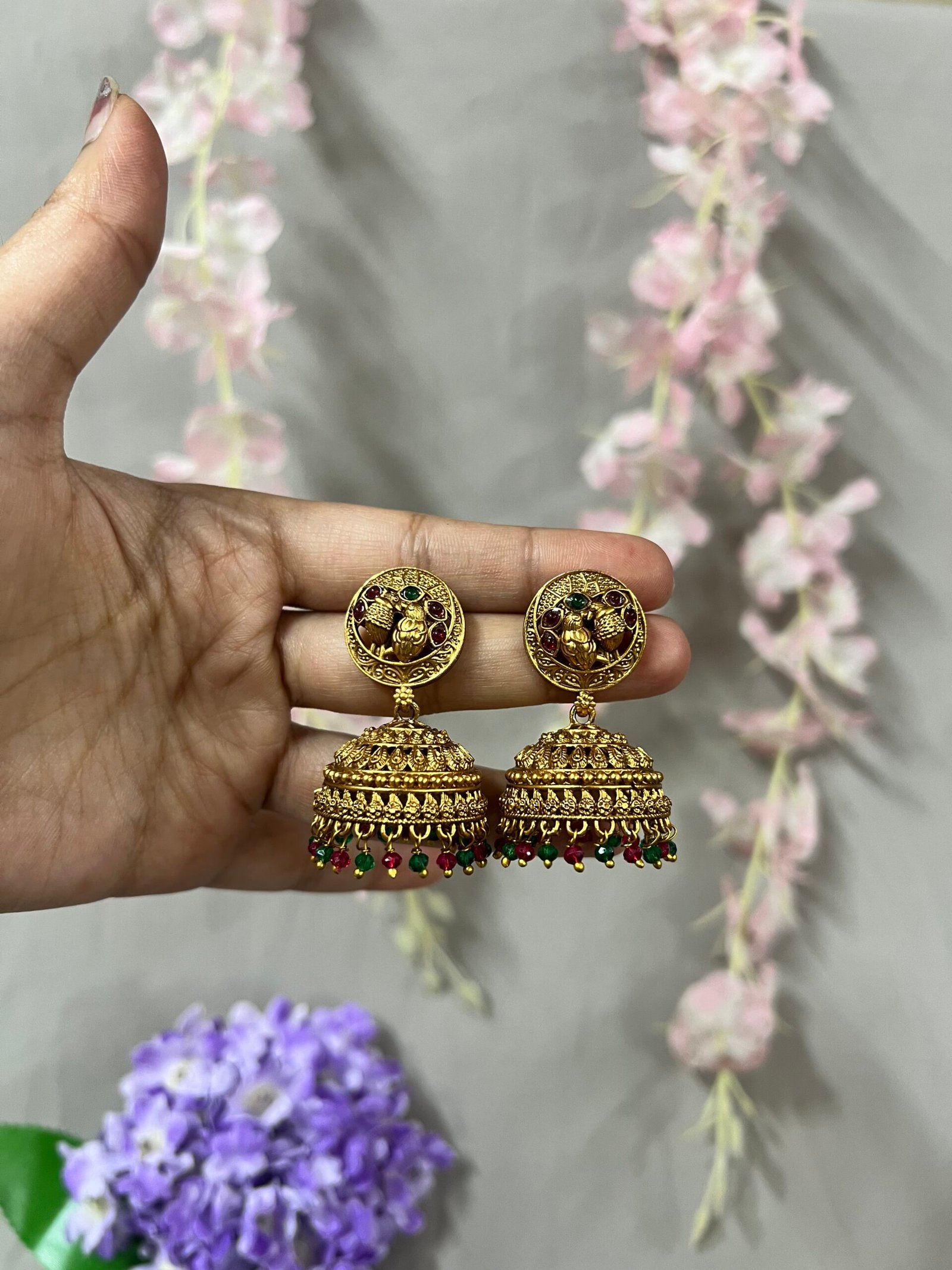 Embellished with vibrant red and green stones, these temple earrings reflect festive charm and cultural heritage. The lower edge is adorned with delicate bead danglers in matching hues, adding graceful movement and enhancing their traditional appeal.