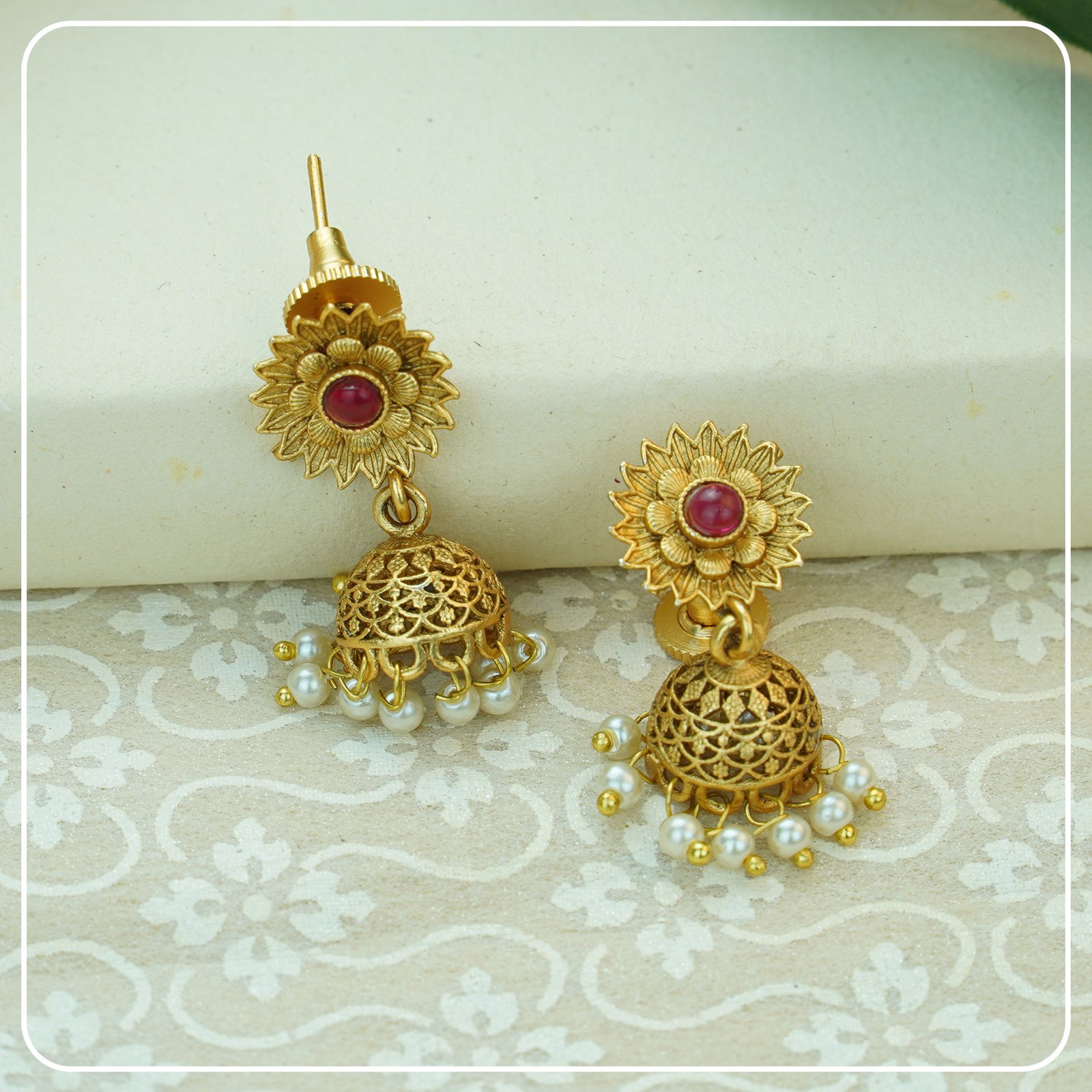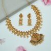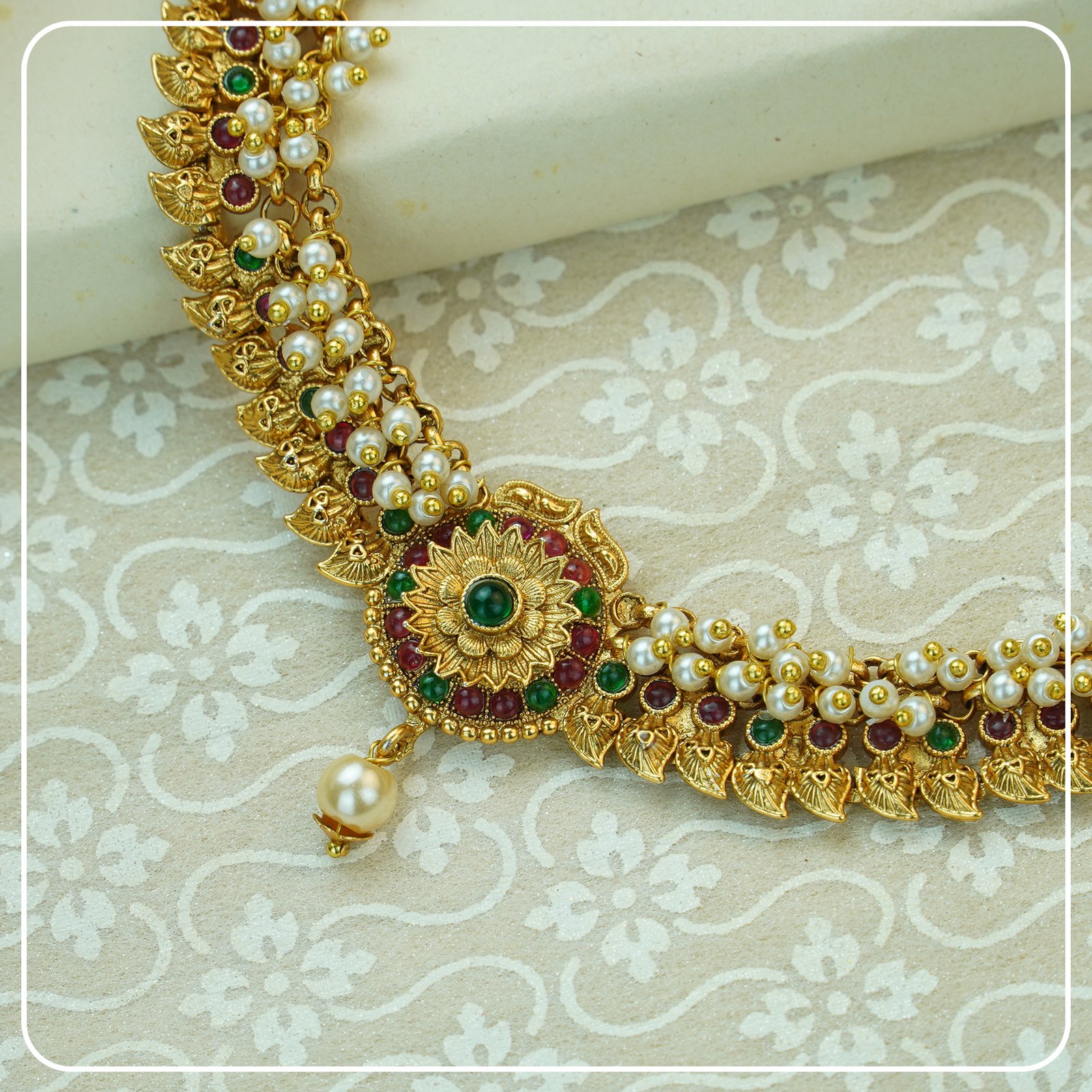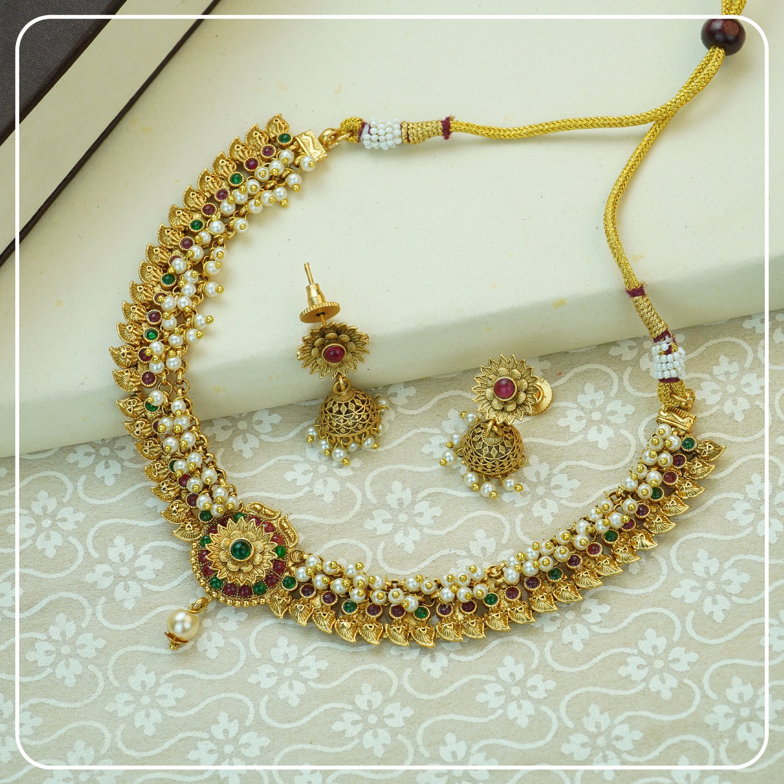This copper-finished necklace, decorated with intricate white beads and beautiful lotus and leaf designs, showcases a timeless, traditional charm. The scattered beads are beautifully enhanced by ruby and green stones, adding to its overall elegance. The necklace features a mop chain, which allows for an adjustable length to ensure a perfect fit. Paired with matching earrings, secured with a post and back closure, this set is perfect for daily wear, as well as weddings and festive events. It brings a touch of luxury and sophistication, making it a versatile and stunning accessory.