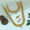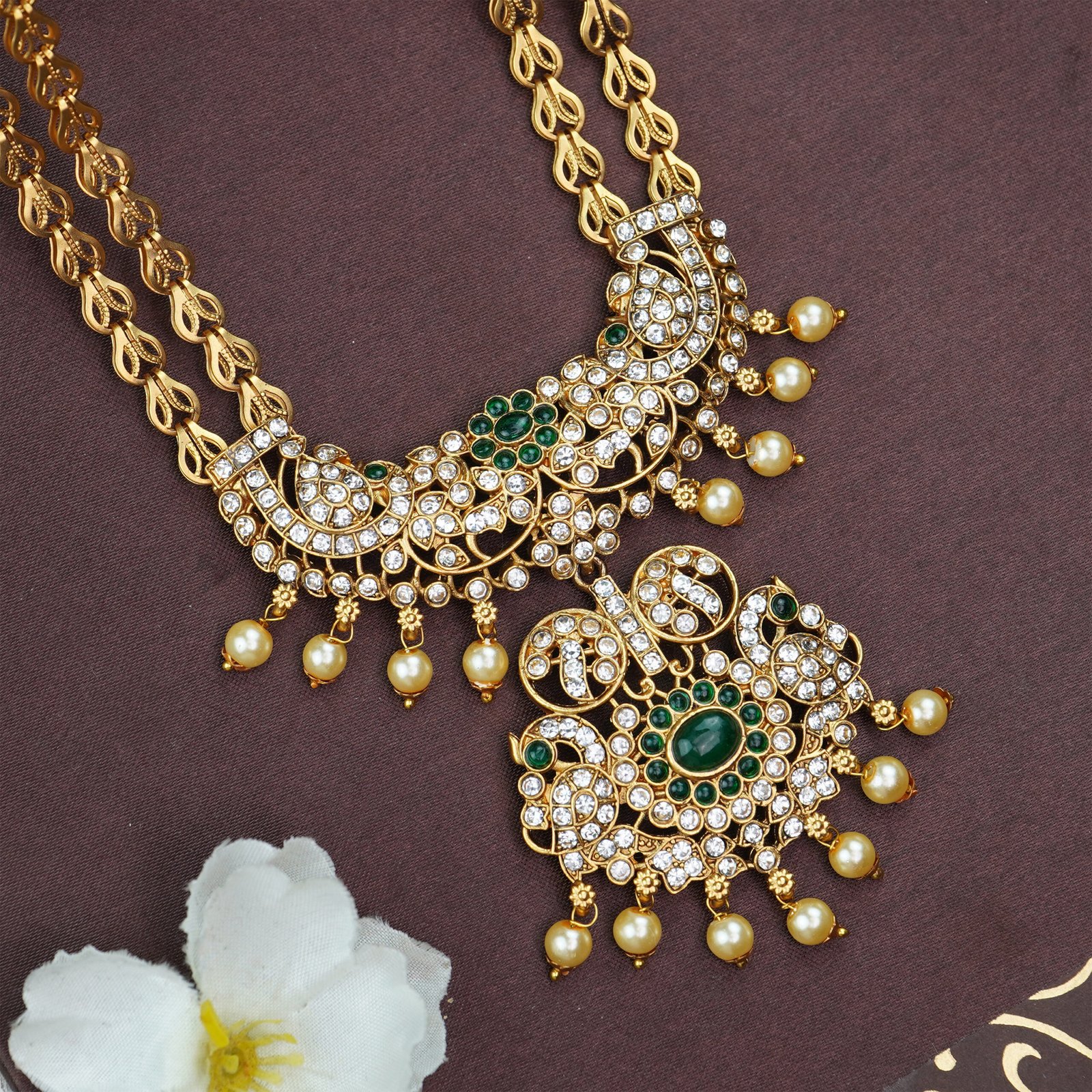 This stunning long set is designed to make you feel like queen. With a matte finish and elegant white and green stones, it creates a beautiful contrast and depth. The set also includes a matching pair of earrings that perfectly complement the long set,