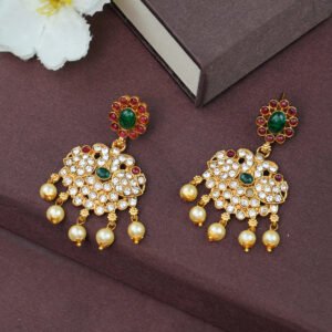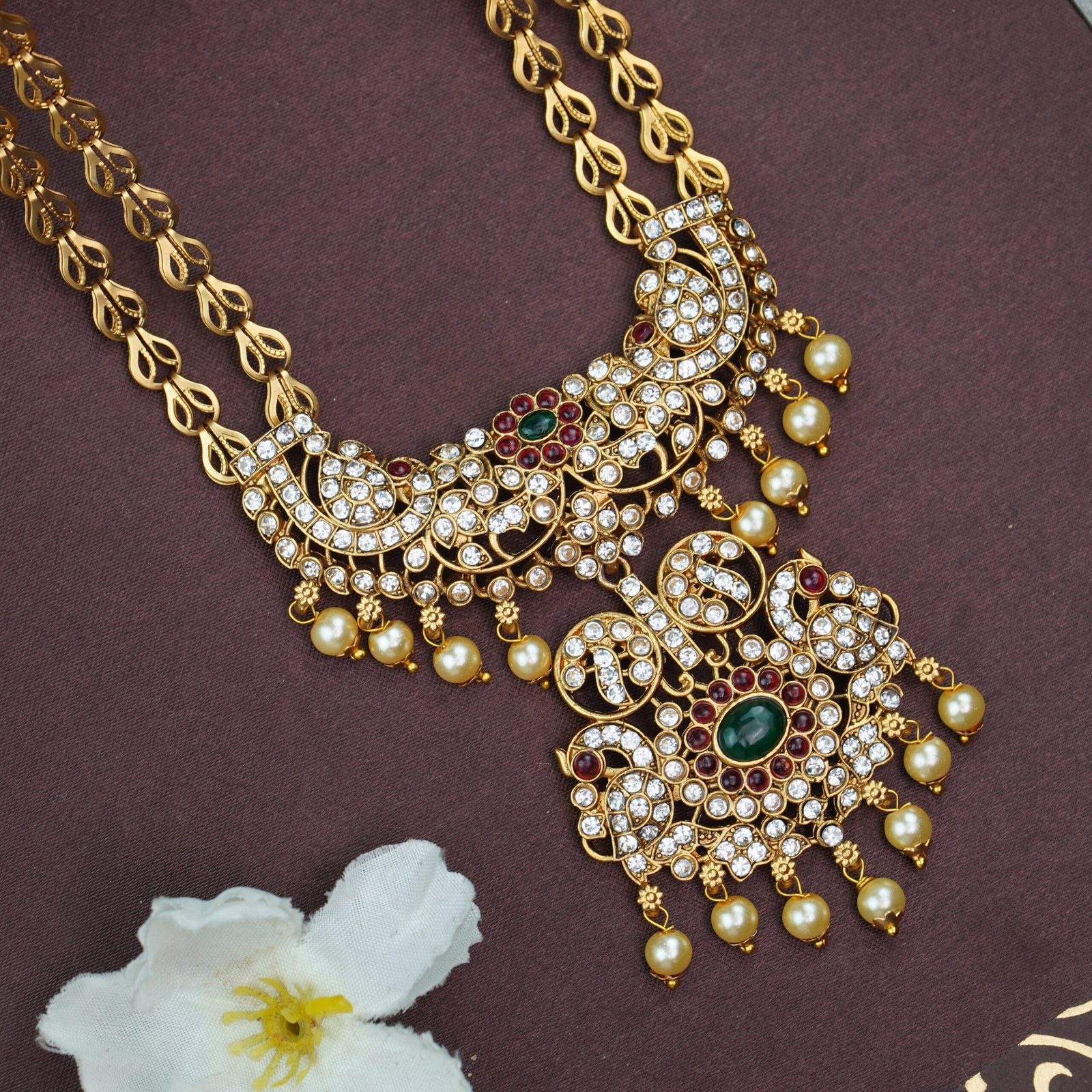 This stunning long set is designed to make you feel like queen. With a matte finish and elegant white , green and maroon stones, it creates a beautiful contrast and depth. The set also includes a matching pair of earrings that perfectly complement the long set, this long set brings a regal charm to any occasion.