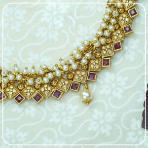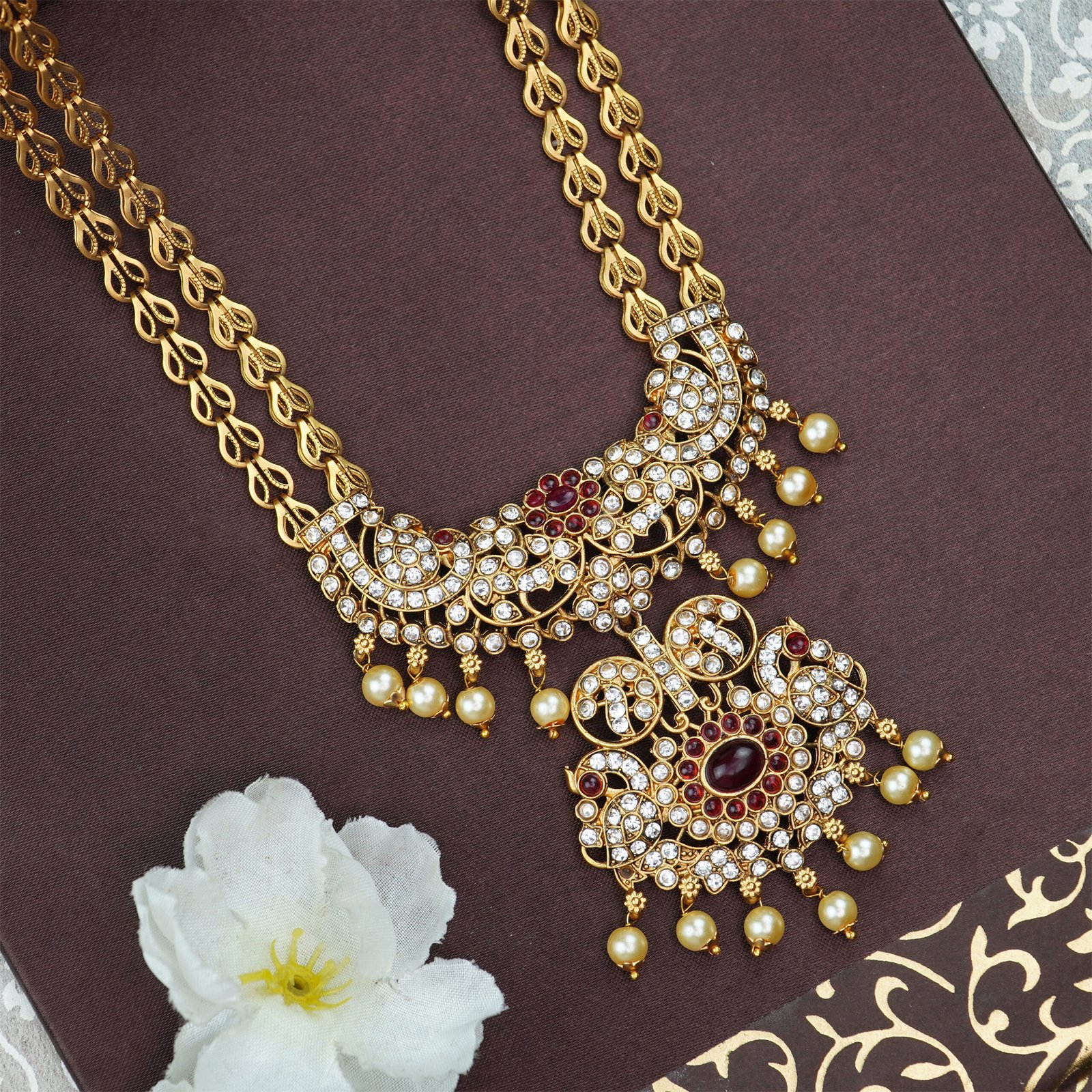 This stunning long set is designed to make you feel like queen. With a matte finish and elegant white and maroon stones, it creates a beautiful contrast and depth. The set also includes a matching pair of earrings that perfectly complement the long set,
