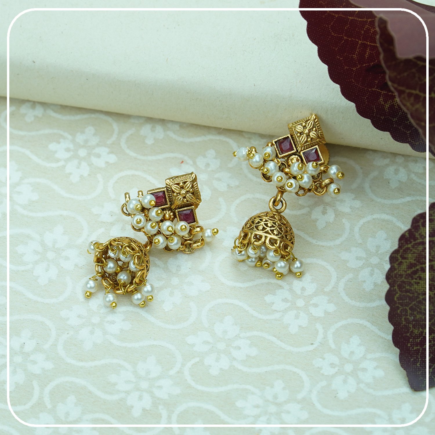 This exquisite copper-finished necklace exudes timeless, traditional charm. Adorned with intricate white beads, it is further enhanced by scattered ruby stones that add a touch of elegance and sophistication. The necklace features a mop chain with an adjustable length, ensuring a comfortable and perfect fit.