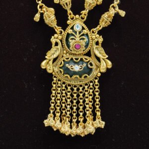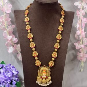 A celebration of prosperity and tradition, the Vaibhav Lakshmi Temple Long Set is inspired by the grandeur of South Indian temple jewellery and festive deity adornments. The long haram features intricately detailed antique-gold elements accented with vibrant kemp-tone colors, creating a rich, ceremonial look.