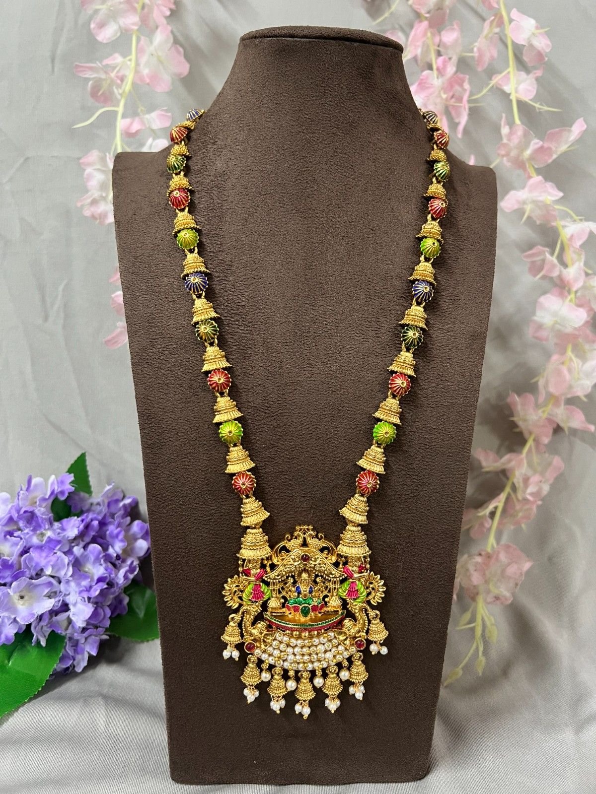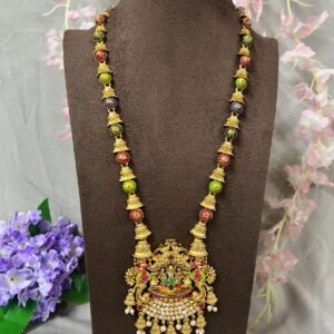 At the centre sits an ornate temple pendant depicting divine artistry, highlighted with colourful embellishments and finished with layers of delicate pearl hangings and jhumki drops that sway gracefully with every movement. The rhythmic pattern of traditional motifs across the chain gives the necklace a regal presence — perfect for bridal wear, festive occasions, and silk saree styling.