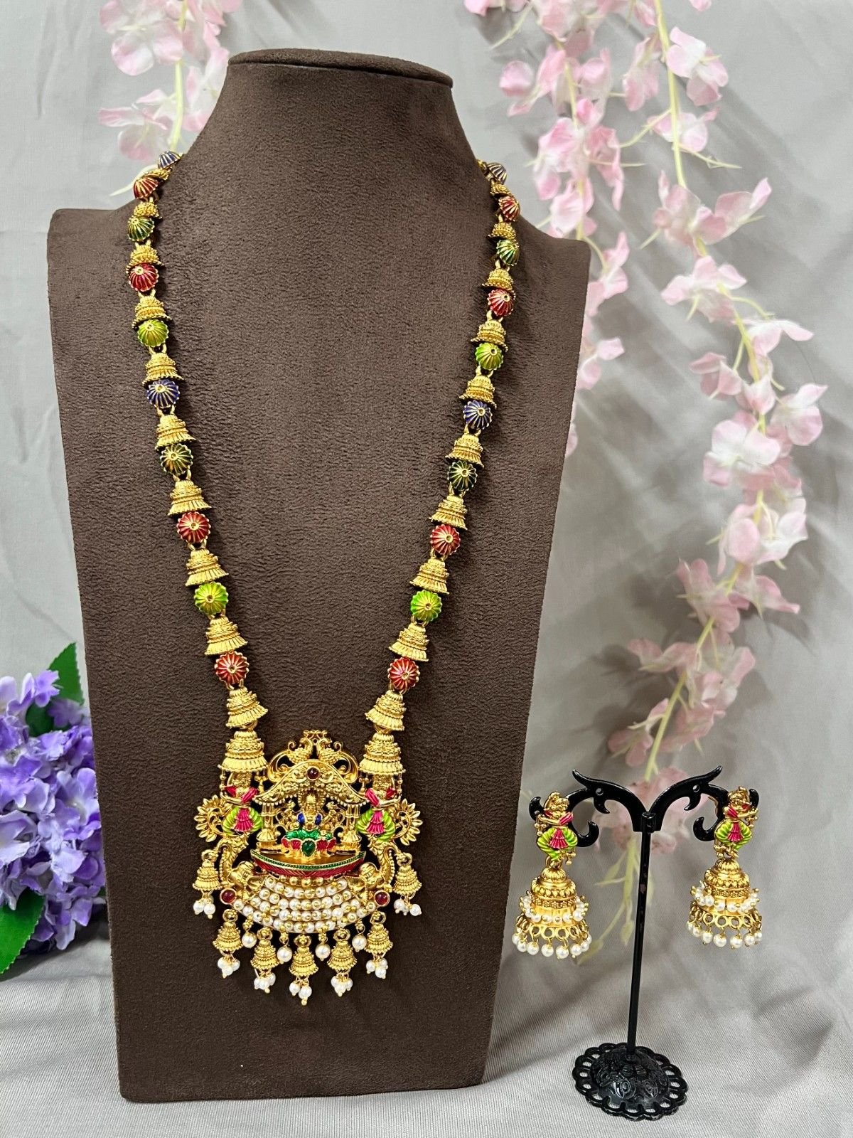 Paired with matching jhumka earrings, this set embodies abundance, grace, and auspicious elegance — making it an ideal statement piece for weddings, poojas, and celebrations.