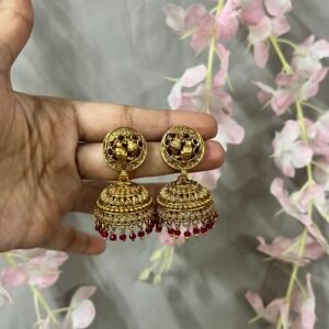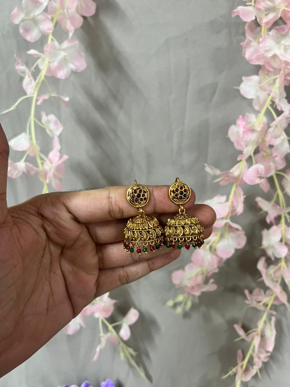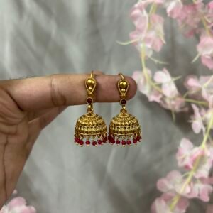 These beautifully crafted jhumkas feature a round floral stud adorned with deep red stones arranged in a traditional pattern, adding a subtle yet festive charm. The antique gold dome showcases intricate carvings inspired by heritage temple motifs, giving the earrings a rich, vintage appeal.